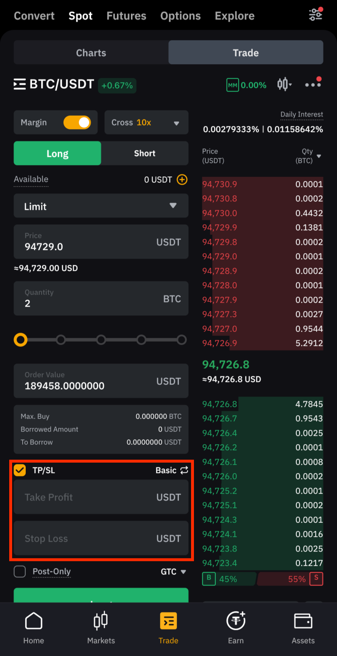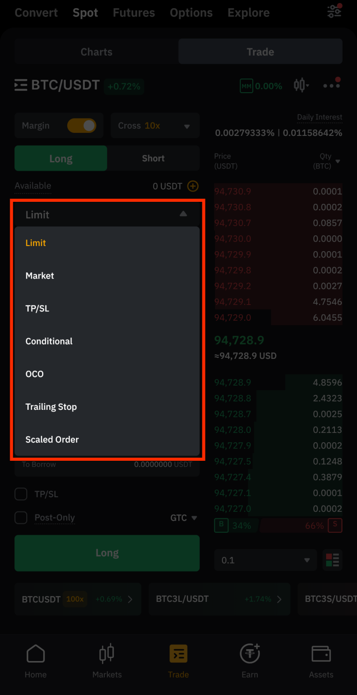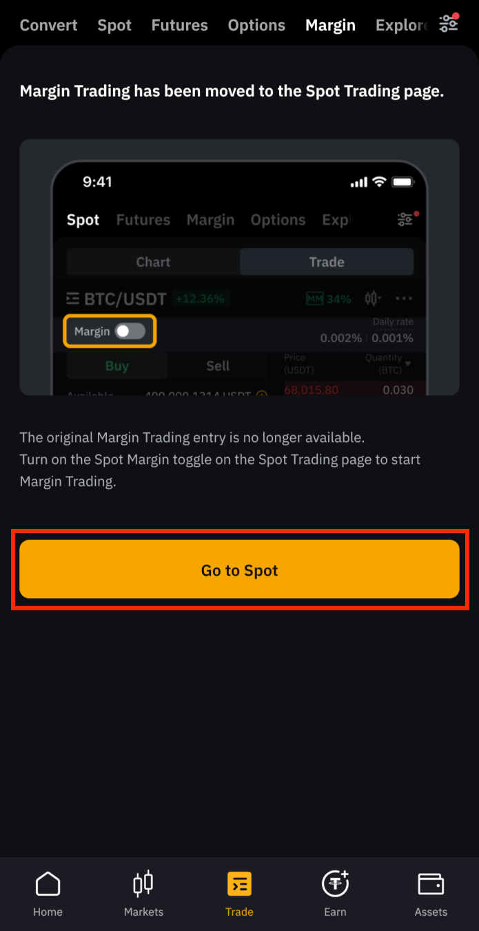 기본 설정은 'Spot' 거래로 되어 있으니, 상단에서 Margin을 선택해 마진 거래 화면으로 이동합니다.