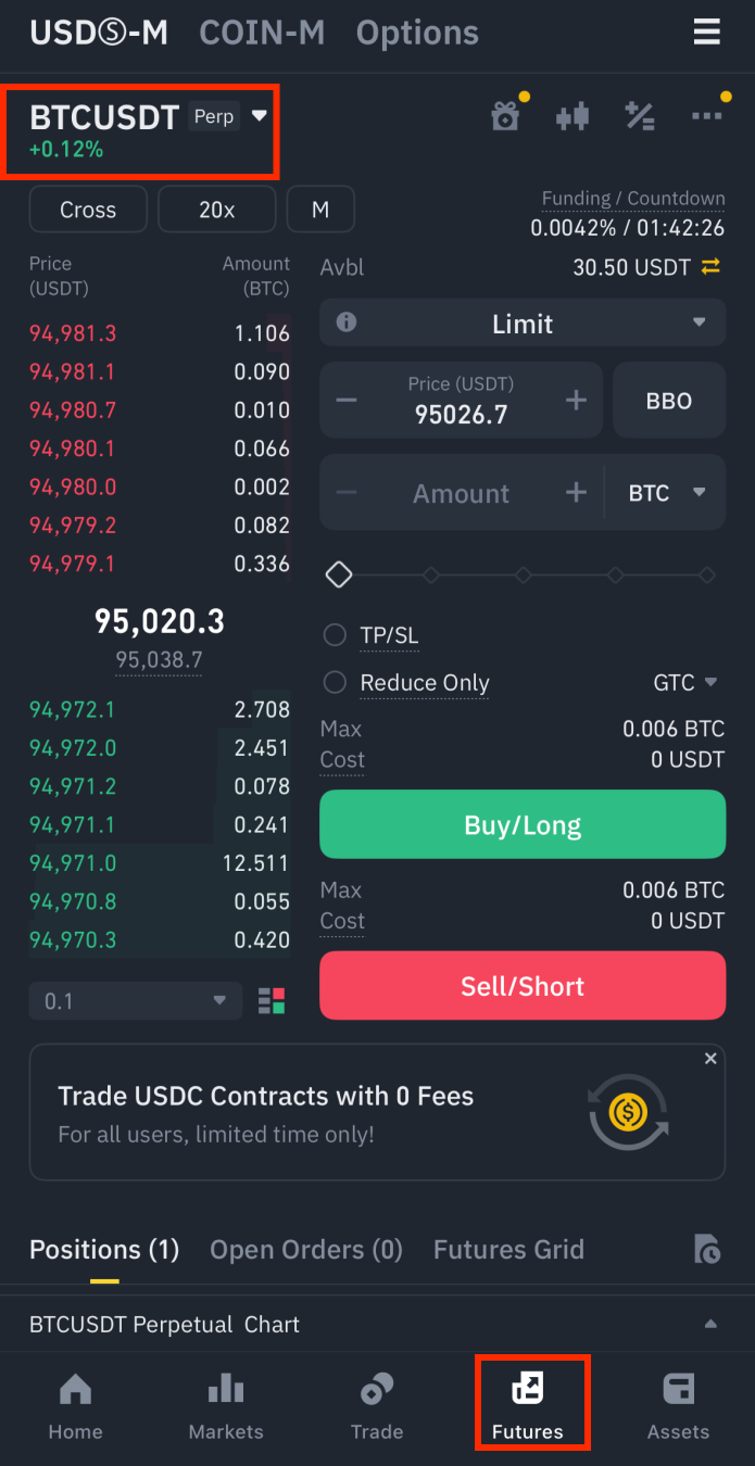 하단 메뉴에서 'Futures' 클릭 → 상단 좌측 코인 검색