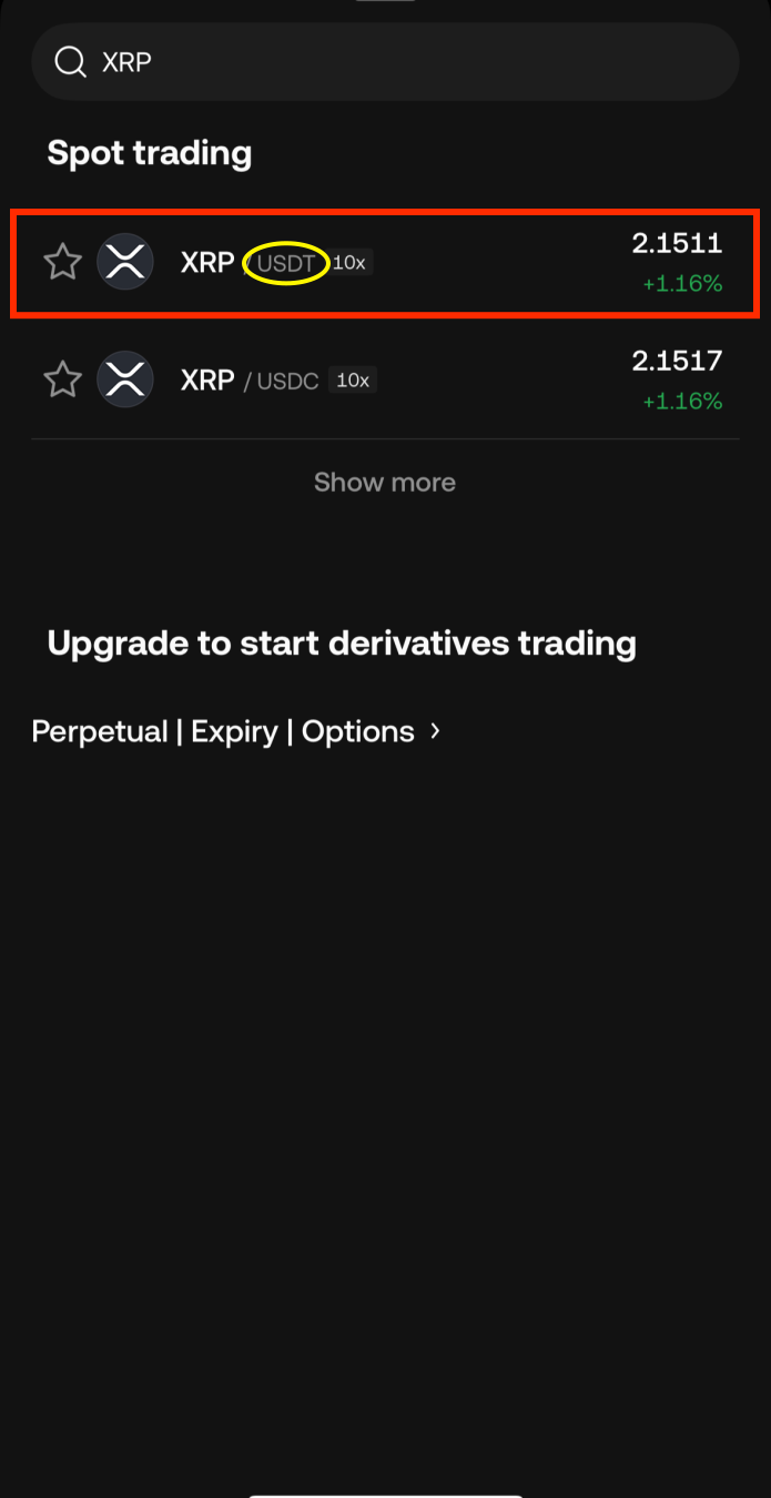 - 하단의 Assets 메뉴에 들어가 리플 판매를 통해 생긴 USDT를 확인할 수 있습니다.