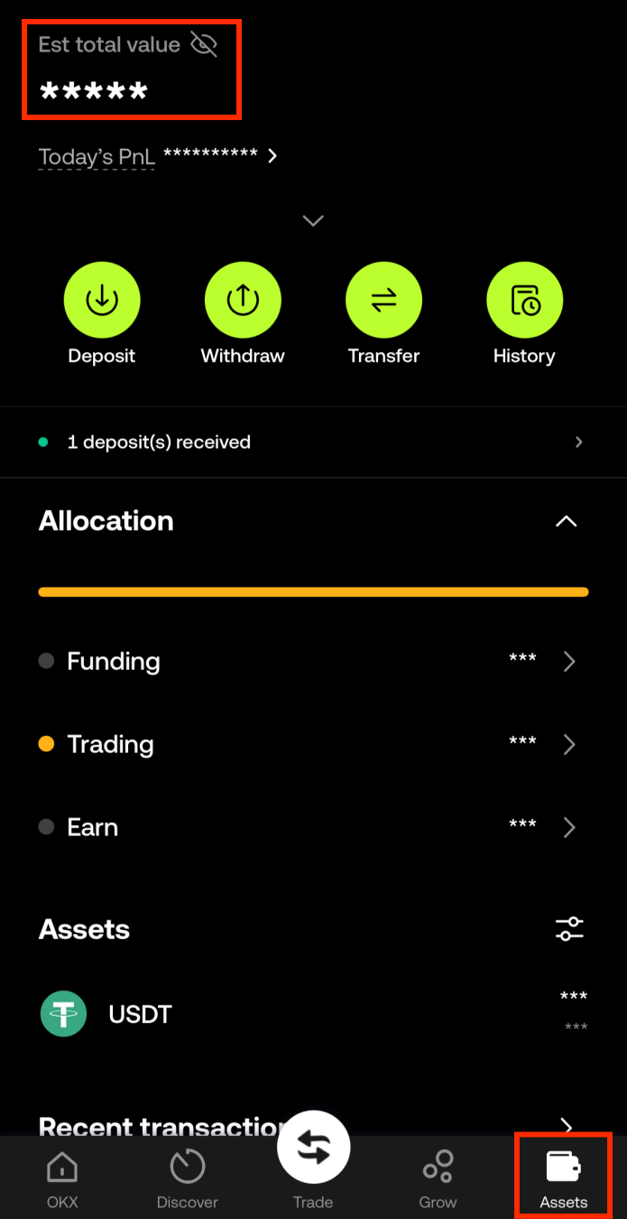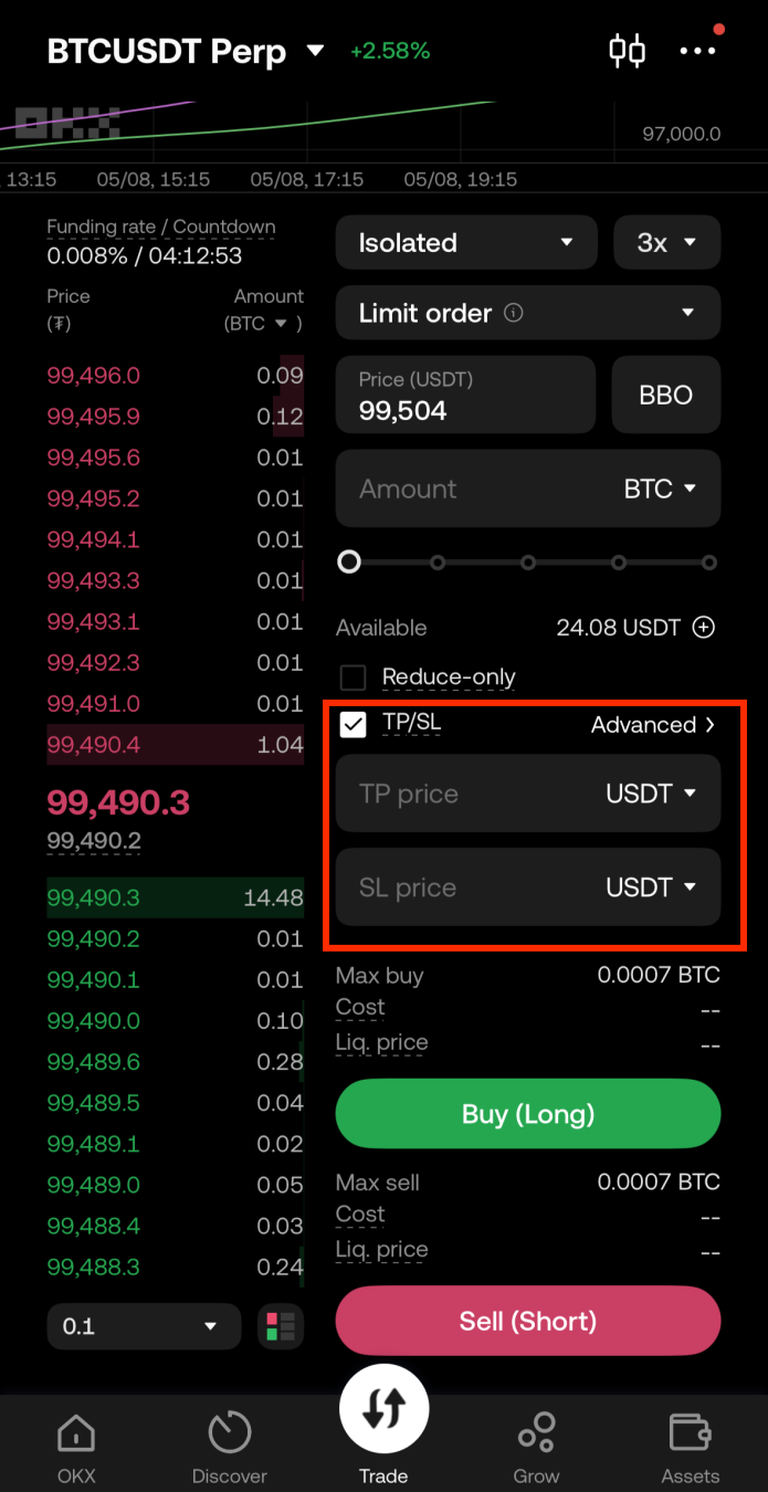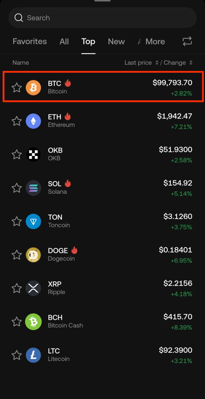 - OKX 앱을 실행하고, 하단 메뉴에서 'Trade'를 클릭합니다.