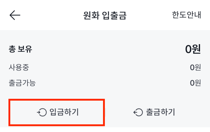 화면 중단의 Deposit 버튼을 눌러 입금 메뉴로 진입합니다.