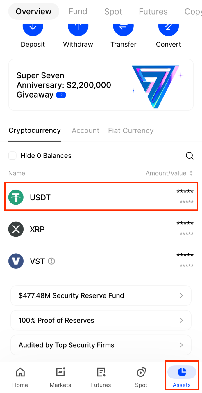 매도 완료 후 다시 Assets 메뉴로 이동하면 USDT 잔액이 확인됩니다.