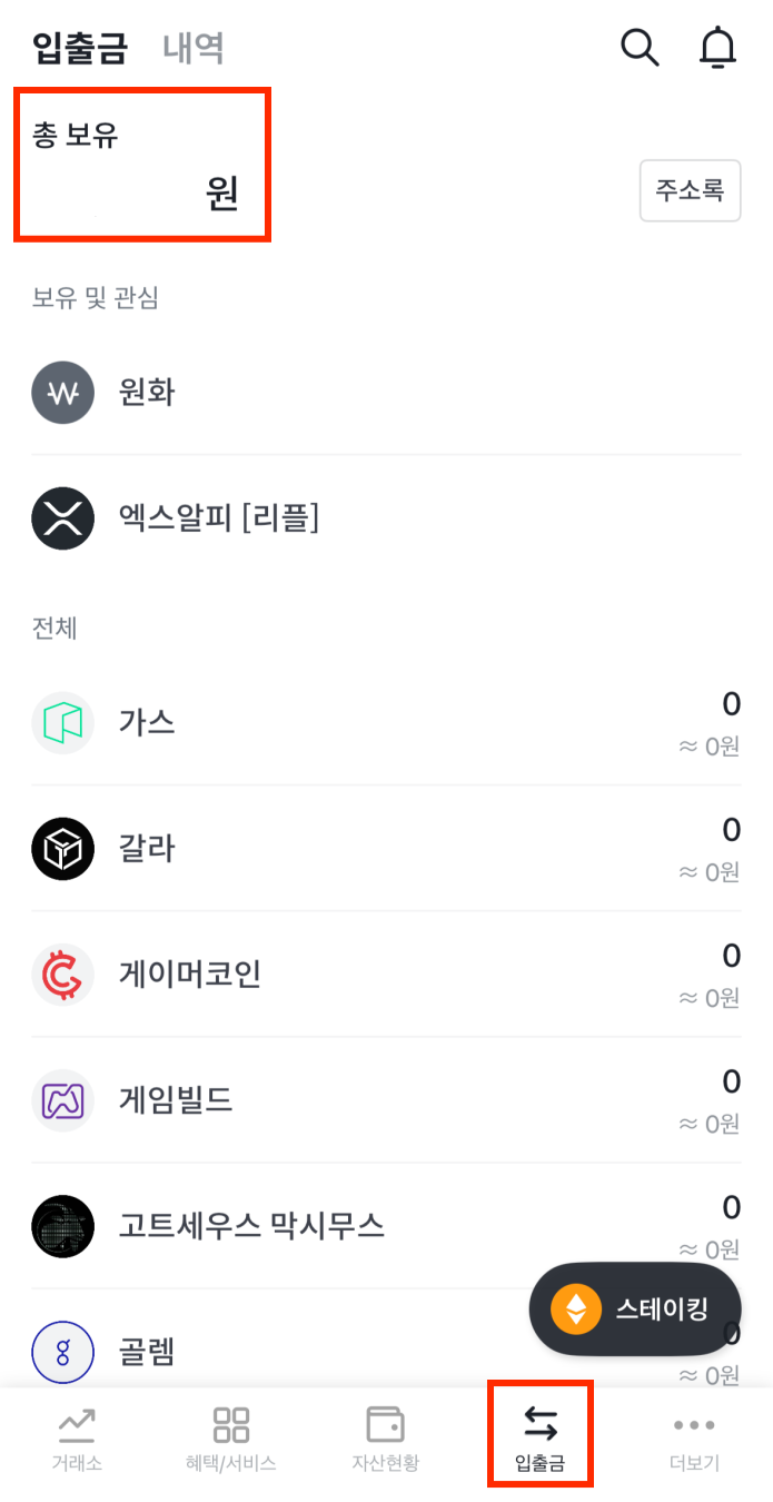 빗썸 앱을 실행한 후, 하단의 입출금 메뉴를 클릭합니다.