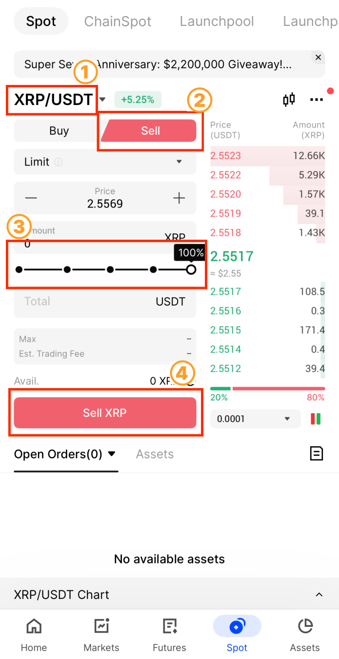 거래 코인을 XRP/USDT로 설정, 원하는 수량을 입력한 후 Sell XRP를 눌러 XRP를 매도합니다.