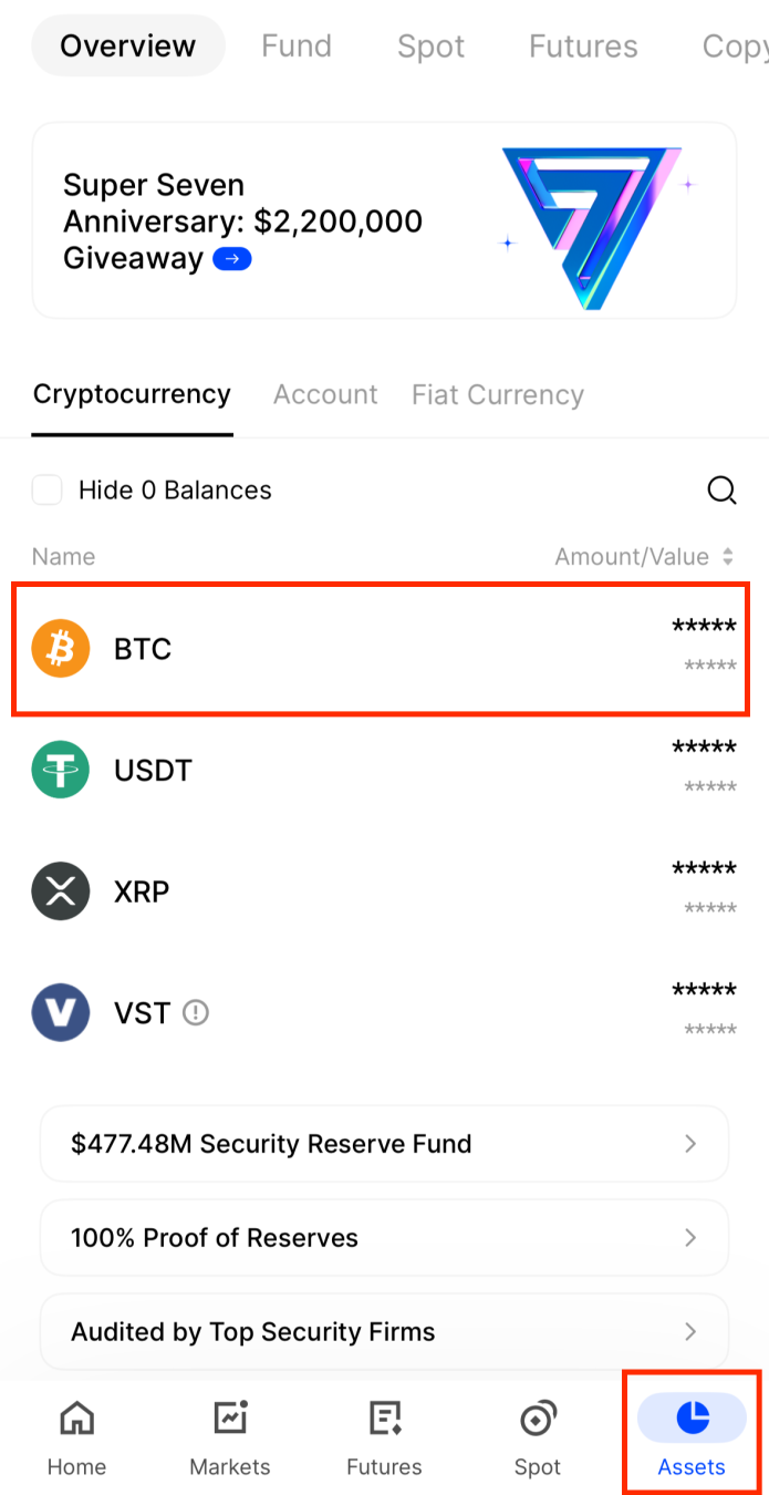 Assets 메뉴에 들어가 구매한 비트코인을 확인할 수 있습니다.