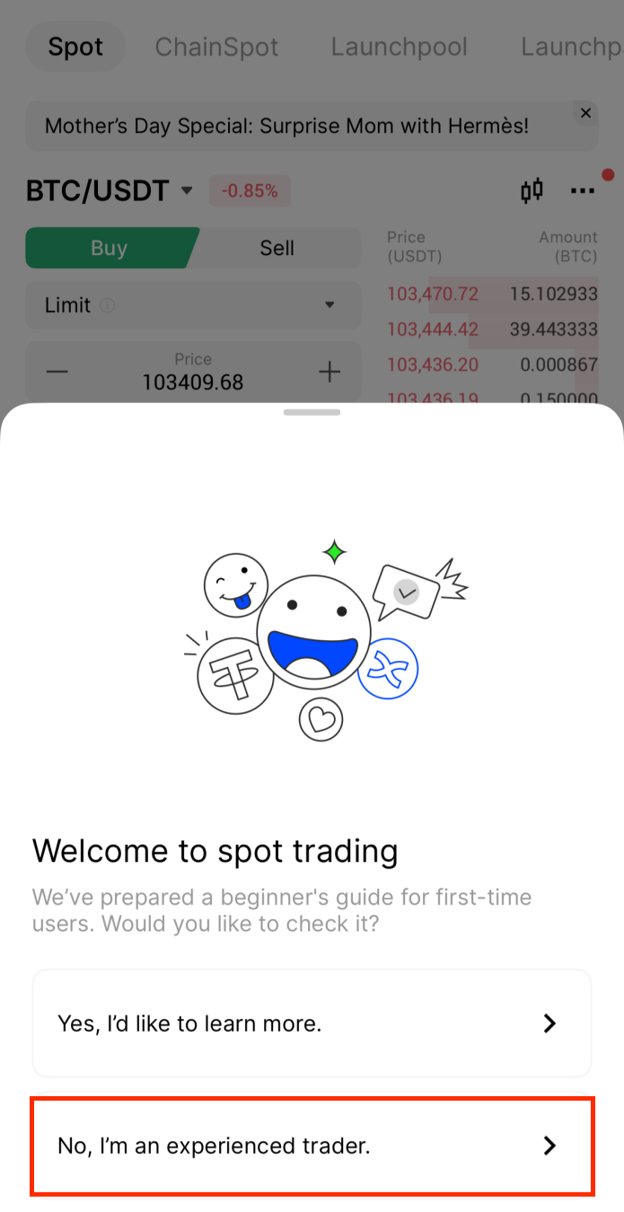 ① 팝업 메뉴가 나타나면 Spot을 선택해 현물거래 화면으로 이동합니다.