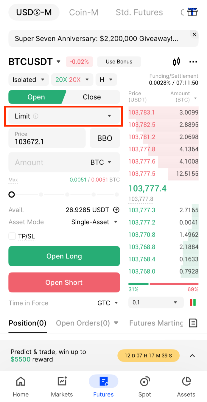 - Limit (지정가): 사용자가 지정한 가격에 도달하면 체결