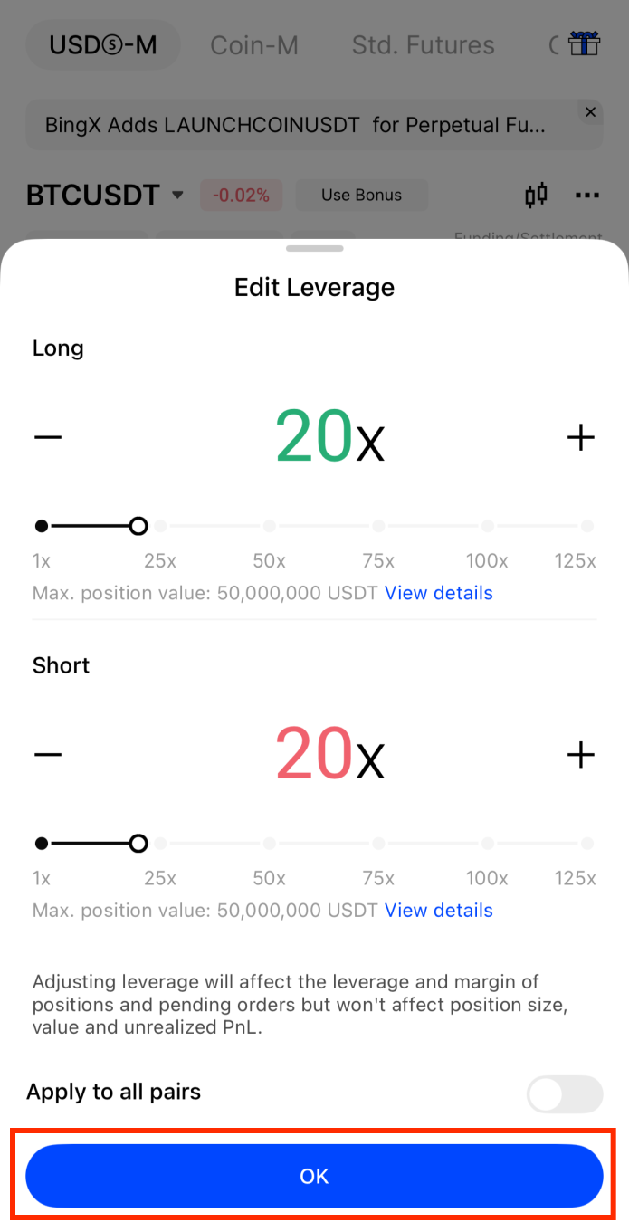 ② 롱/숏 각각의 배율을 설정합니다. (예: Long 20x / Short 20x)