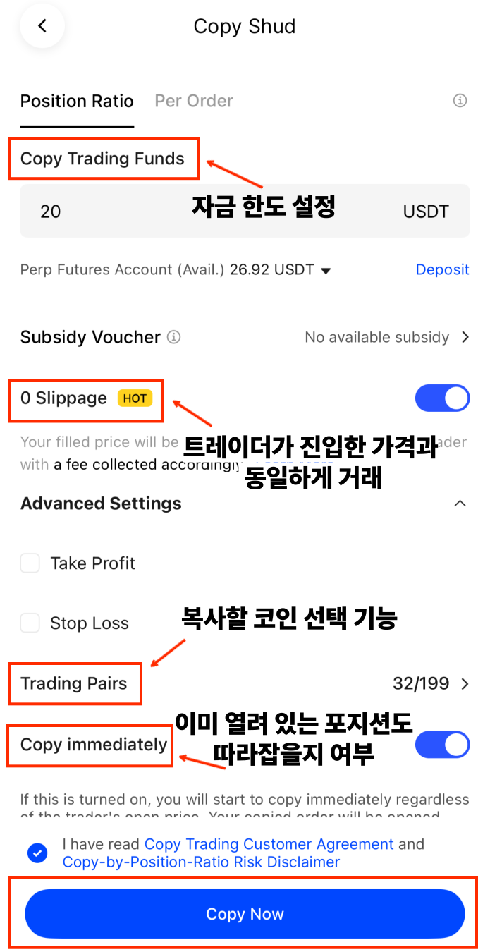 ④ 이어지는 화면에서는 자금 한도 및 구체적으로 카피할 항목을 설정합니다.