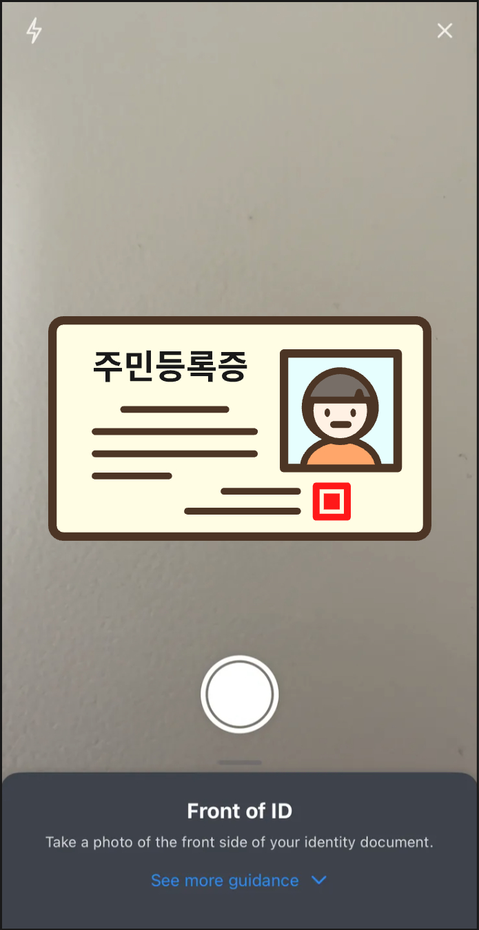 ⑥ 다음으로 선택하신 신분증의 앞면을 촬영 후, 셀카(Selfie)를 촬영해 주세요.