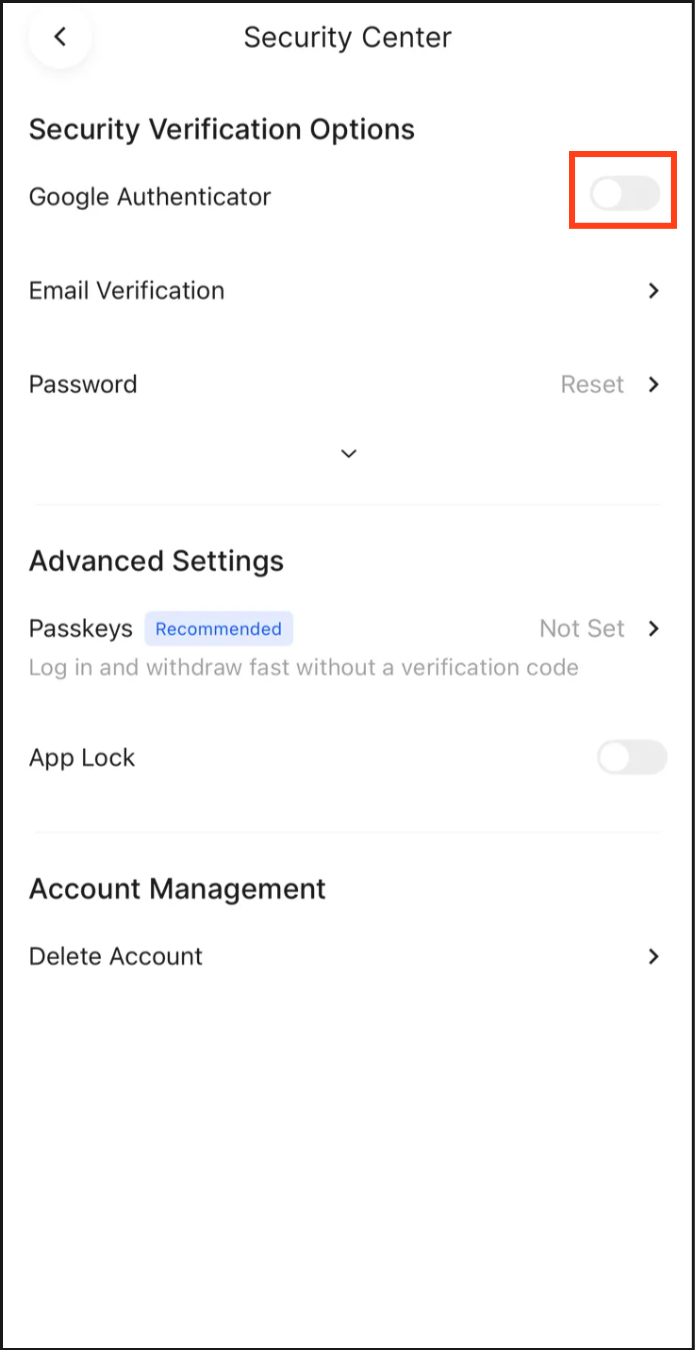 빙엑스 앱을 실행한 뒤, 왼쪽 상단의 '프로필 아이콘'을 눌러 주시고, 아래로 스크롤하여 'Security Center(보안 센터)' 메뉴를 선택해주세요.