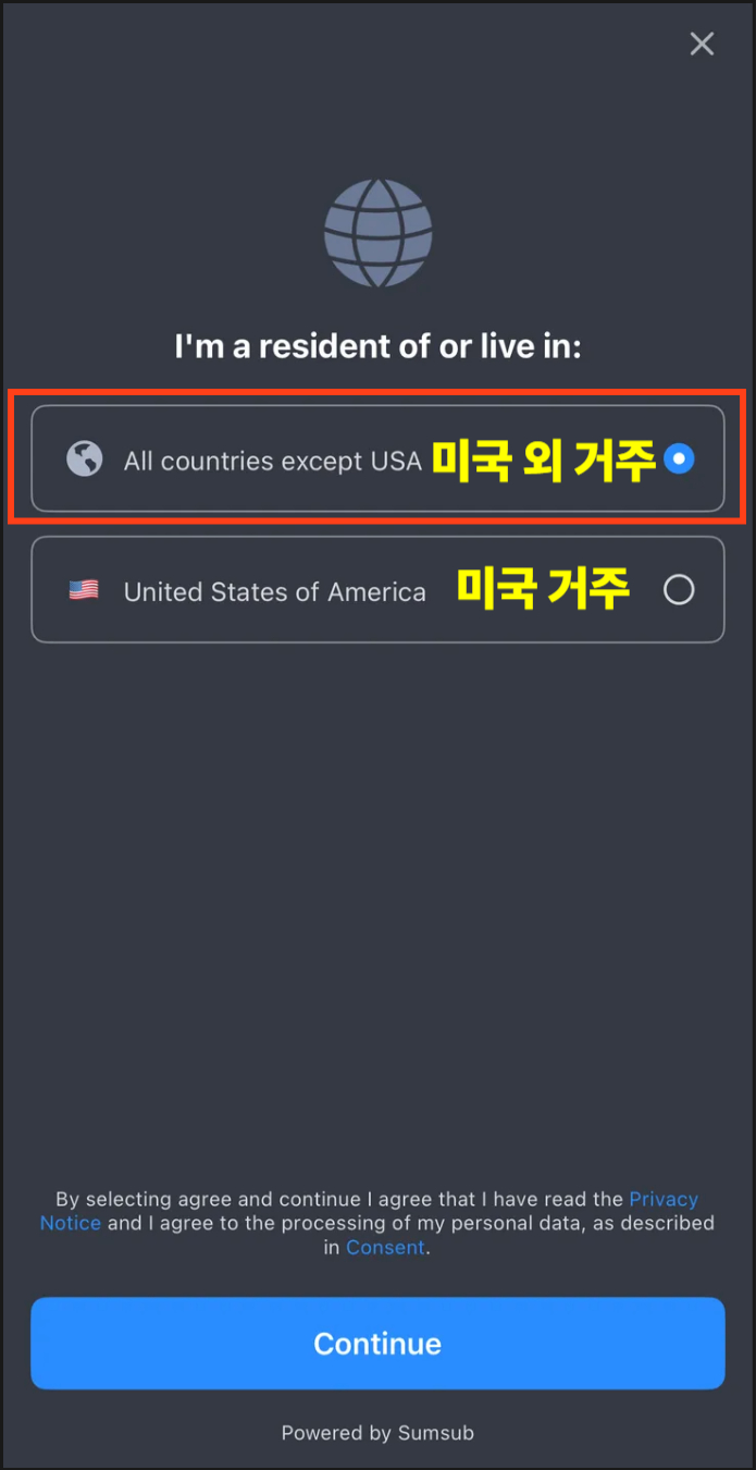 ③ 다음은 거주 국가 선택 화면입니다. 한국에 거주하시면 All countries except USA를 눌러주시면 됩니다.