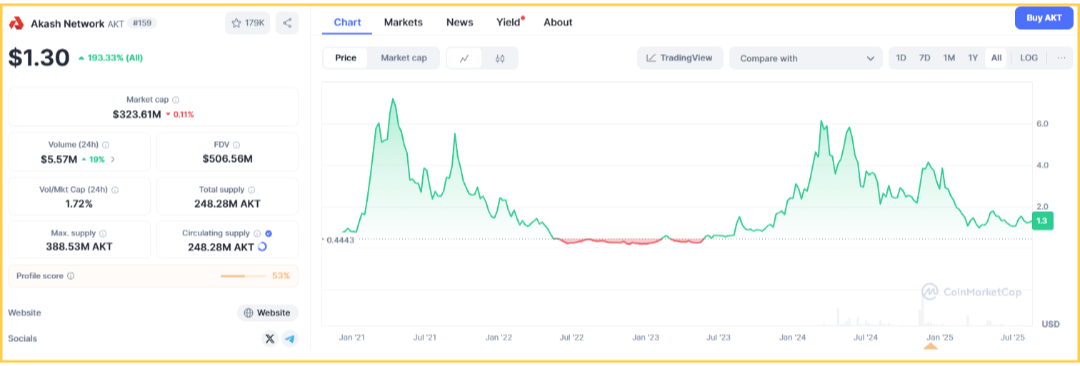 2025년 8월 기준, AKT의 실시간 가격은 약 $1.30 수준이며, 24시간 거래량은 약 $5백만 이상, 시가총액은 약 $3.26억으로 중견급 수준입니다. 순환 공급량은 약 2억 8천만 개, 최대 공급량은 약 3억 8천만 개로 제한된 공급 구조를 갖고 있습니다.