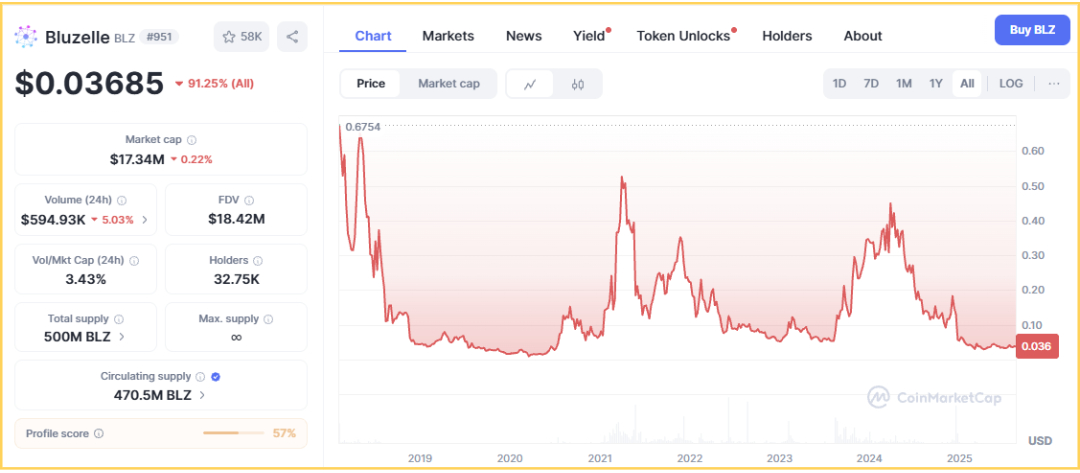 2025년 8월 기준, BLZ는 약 $0.4 내외에서 거래되고 있으며, 시가총액은 약 5천만 달러 수준, 코인마켓캡 기준 약 450~500위권에 위치하고 있습니다. 총 공급량은 약 5억 개, 현재 유통량은 4억 개 이상으로 전체 공급 대비 유통 비중이 높은 편입니다. 이는 희소성보다 현재 유동성과 실사용 가능성이 시장에서 중시되고 있음을 의미합니다.