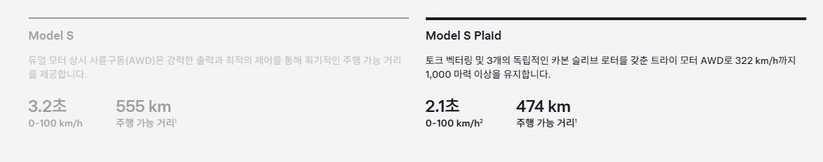 | 모델 S 플레이드 | 2.1초 | 474km | 1.6억 원 | 가속력, 트랙 성능 |
